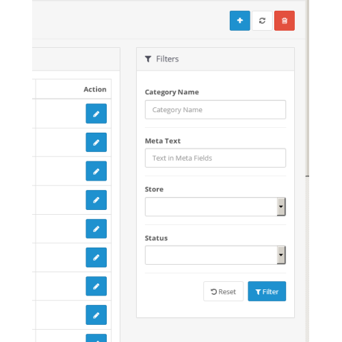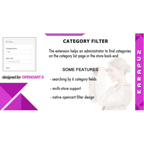 The extension helps an administrator to find categories on the category list page in the store back-end. A filter section is added there with the following parameters: