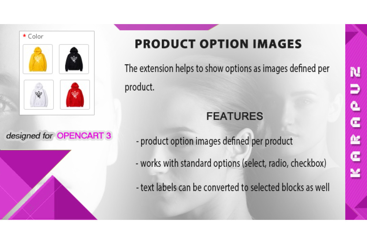 The extension helps to show options as images on product detail pages. The images are defined per products, they differ from global option images.