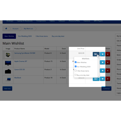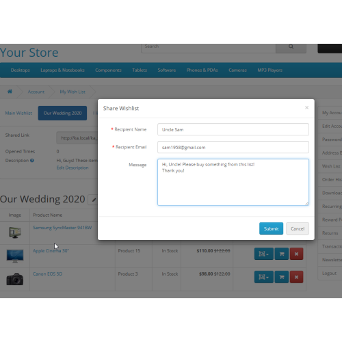 This extension allows customers to send their wishlist items to friends via email or a device share functionality. It is possible to create multiple shared wishlists with different access URLs.